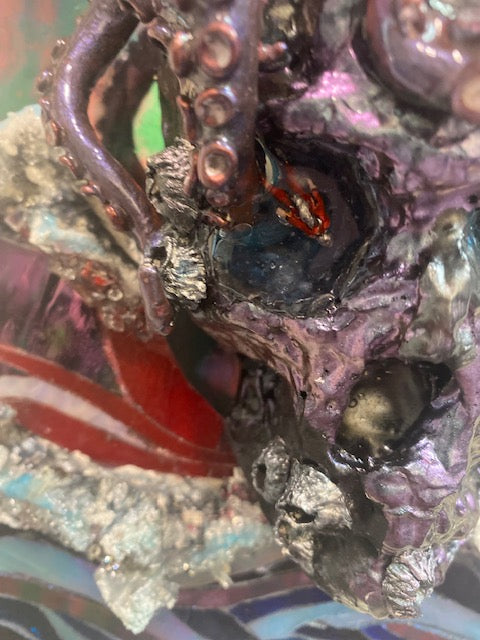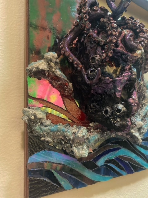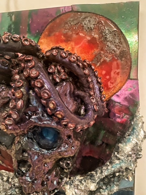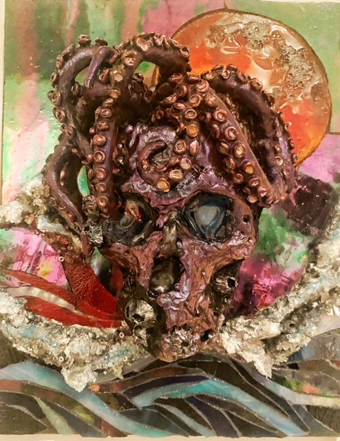 "Blood Moon" is a captivating mixed media art piece that combines various elements to immerse viewers in an ethereal and otherworldly manner. Crafted from Italian glass mosaic and adorned with meticulously hand-molded octopus tentacles and clay barnacles, this artwork transports you to the depths of the darkness that lies beneath. Resin detailing creates the illusion of water in the eyes of the skeleton, enhancing its surreal, lifelike quality.