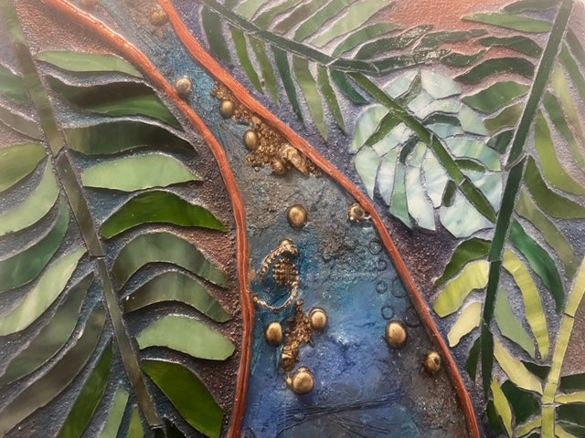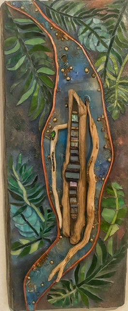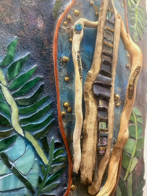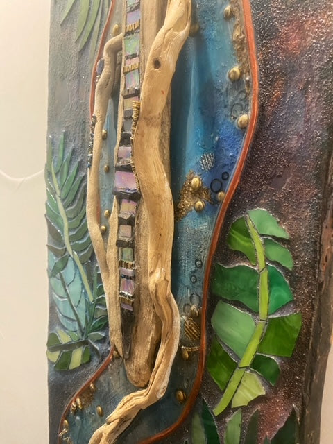 This mixed media artwork is a tactile masterpiece that seamlessly blends elements of Italian glass mosaic, resin, threads, metal, clay, metallic beads, acrylic painted grout, and the weathered beauty of found beach drift wood. Crafted to emulate the lush serenity of a tropical forest with meandering waterways, this 3D composition transports you to an enchanting realm where nature's serenity and artistic ingenuity converge. Each meticulously chosen material contributes to the intricate tapestry of this unique piece, allowing viewers to feel the soothing flow of the water, hear the whispering leaves, and touch the texture of the forest. It's an ode to the harmony of the natural world of tropical serenity.