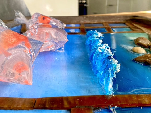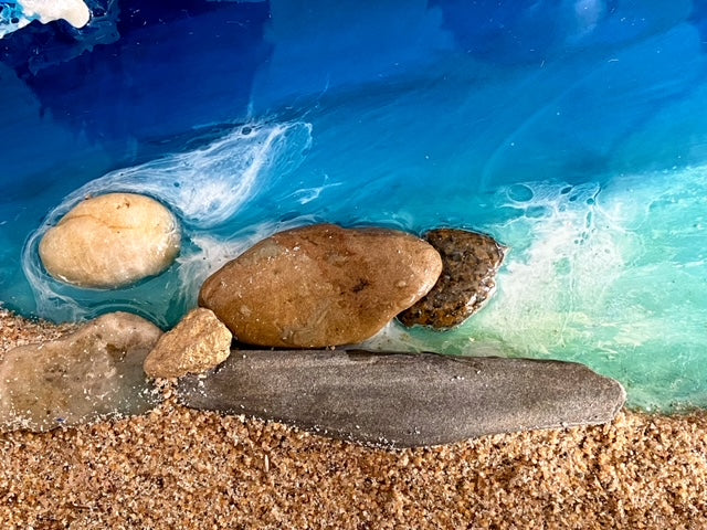 At the edge of the sea line, a thin resin-formed wave rises, suspended half an inch above the surface, capturing the dynamic energy of the ocean. This wave adds depth and dimension to the scene, inviting viewers to immerse themselves in its beauty.