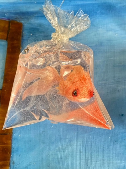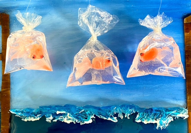 Hanging from the top of the window are three fish encased in bags, their curious gaze fixed upon the ocean beyond. They seem to ponder what it would be like to venture into the expansive waters, their presence adding a whimsical touch to the artwork.