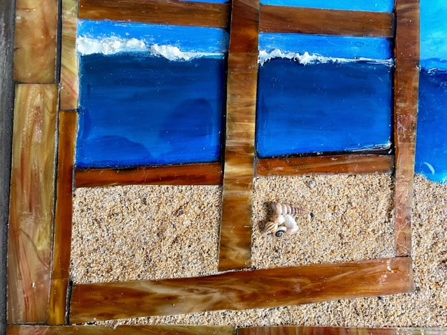 "Daydreams" is 3D art piece that beckons viewers to a serene seascape through an intricately crafted open window. The window itself is made of glass mosaic. Beyond its threshold lies a mesmerizing resin seascape, where the tranquil expanse of beach meets the vastness of the ocean.
