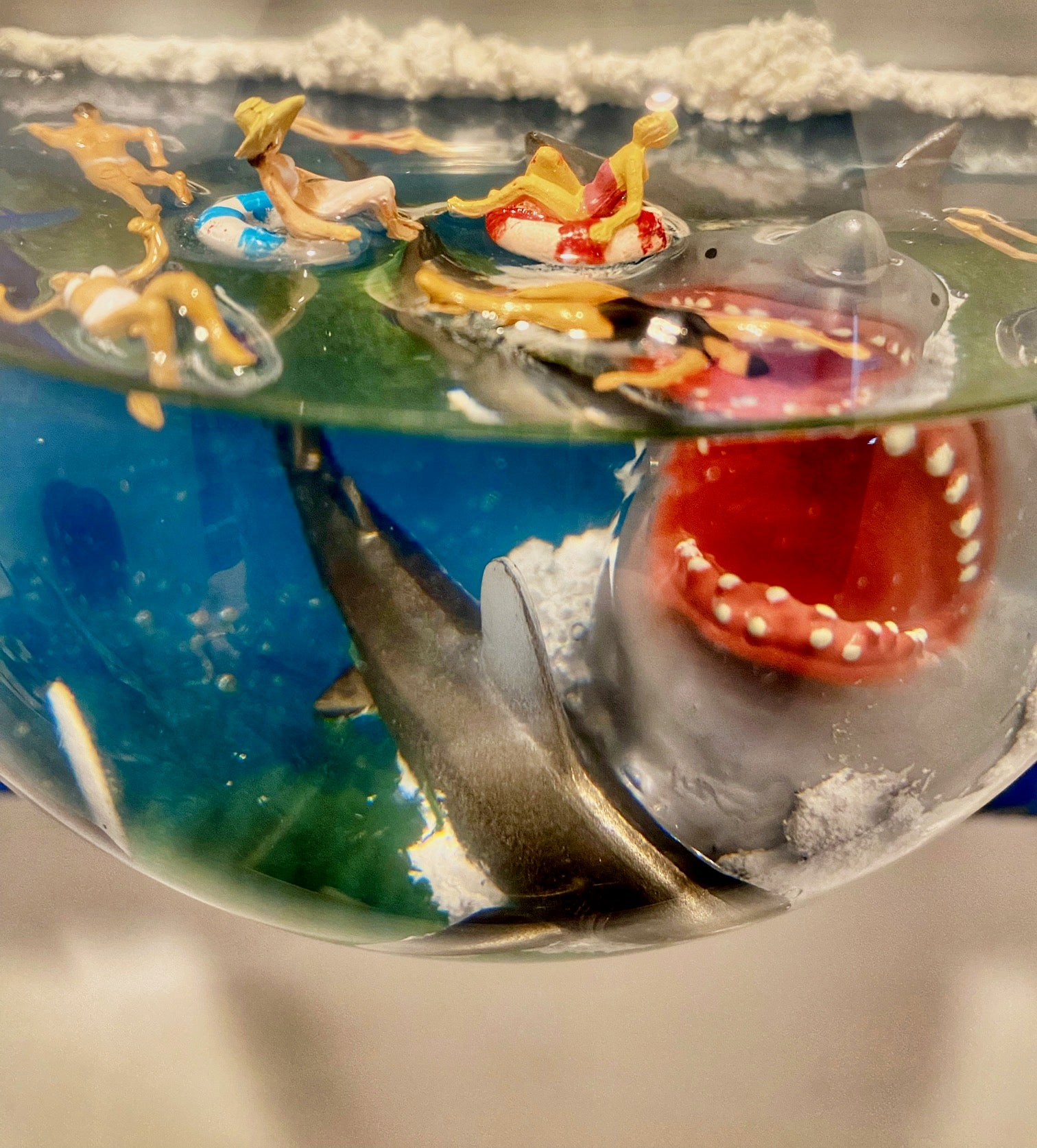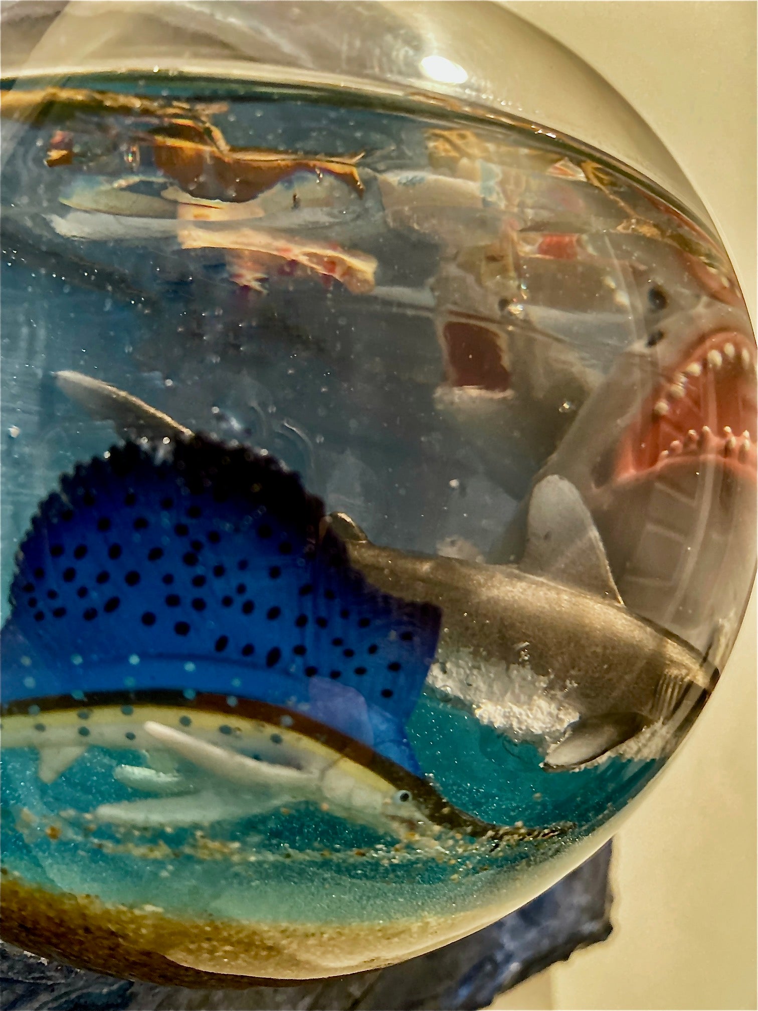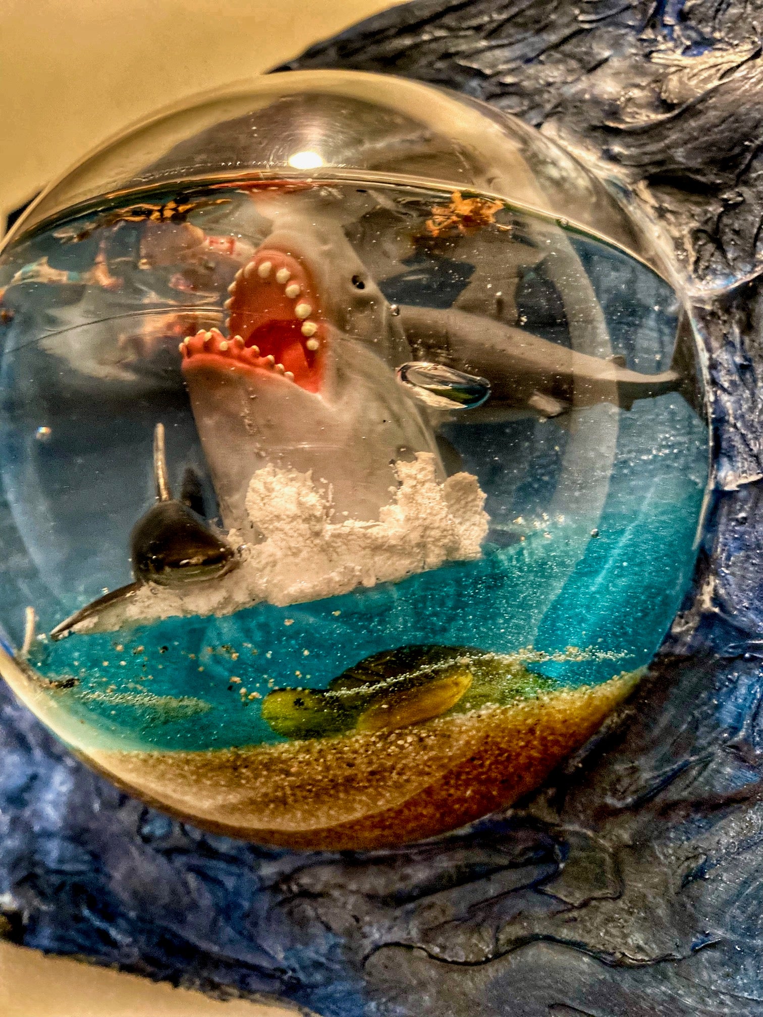 Prepare to be transported into a captivating underwater world with this mesmerizing art piece. Encased within a 9" bubble, a realistic ocean scene unfolds before your eyes. Beneath the crystal-clear surface, a graceful turtle glides gracefully alongside a majestic giant fish, while two sharks lurk beneath, their sleek forms breaking the surface.