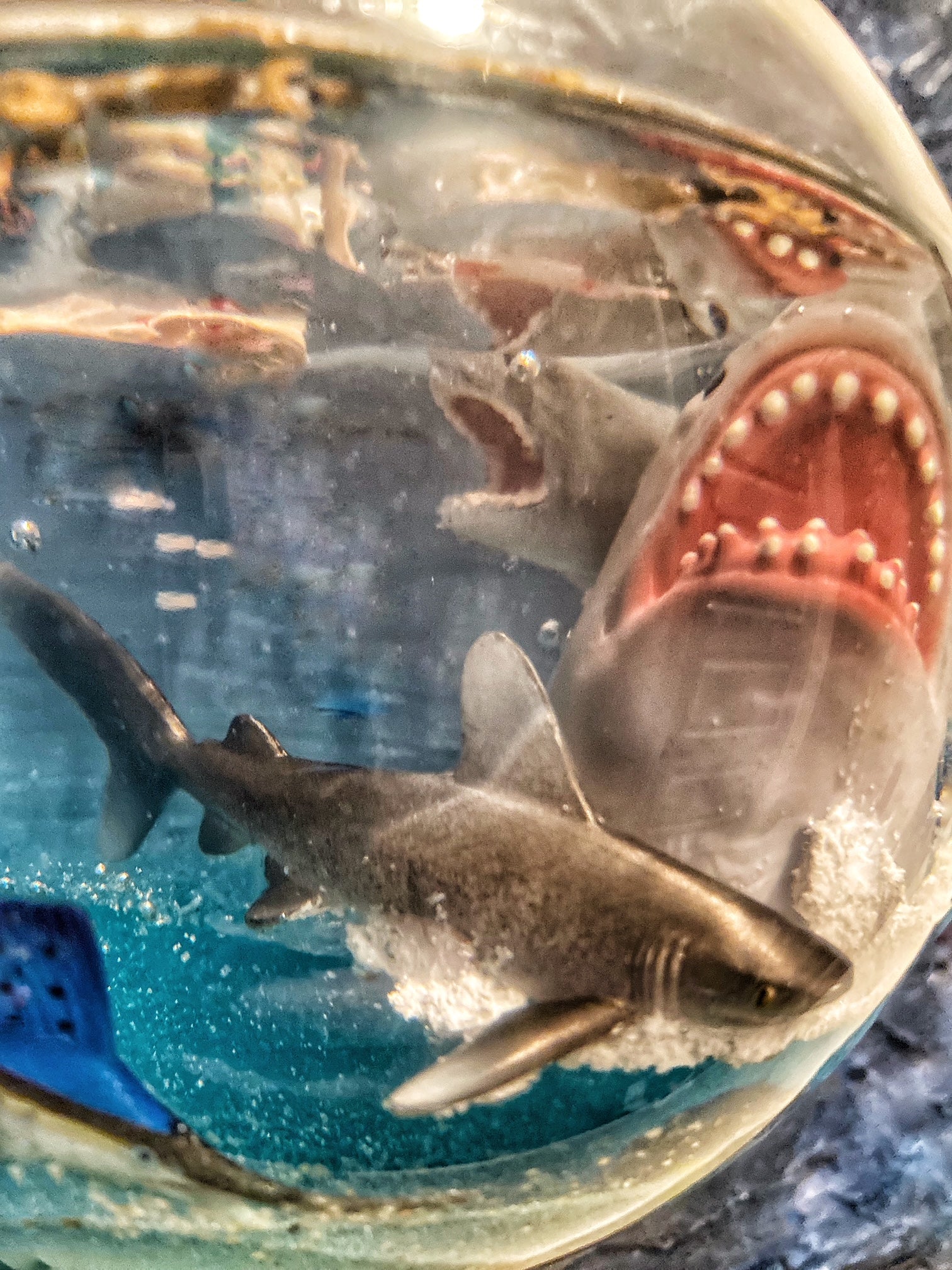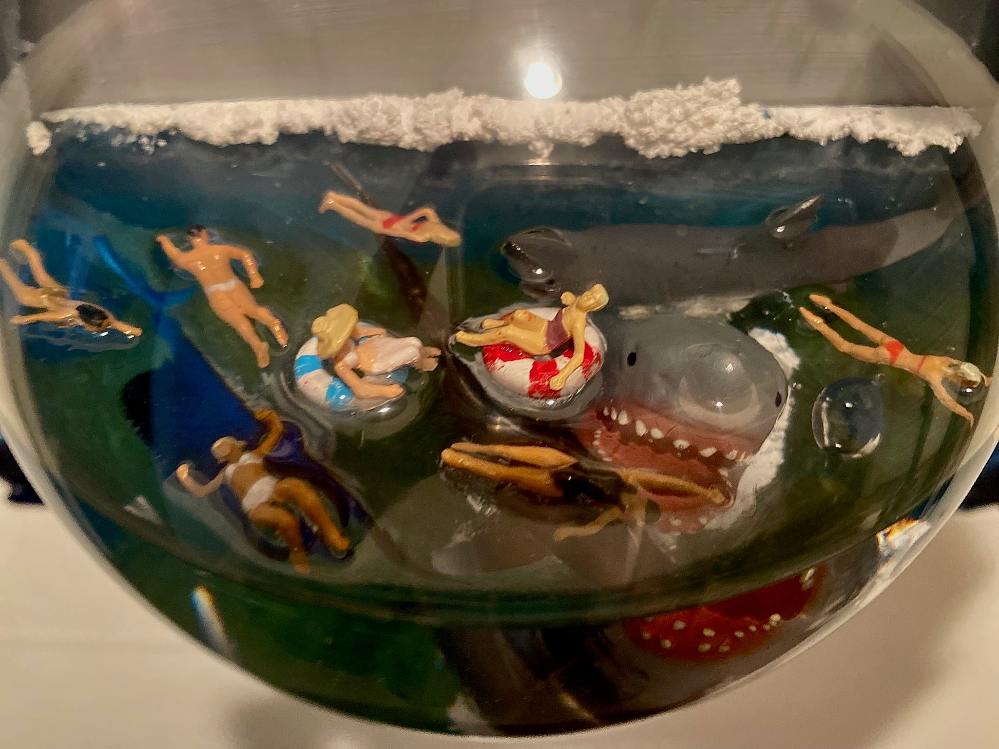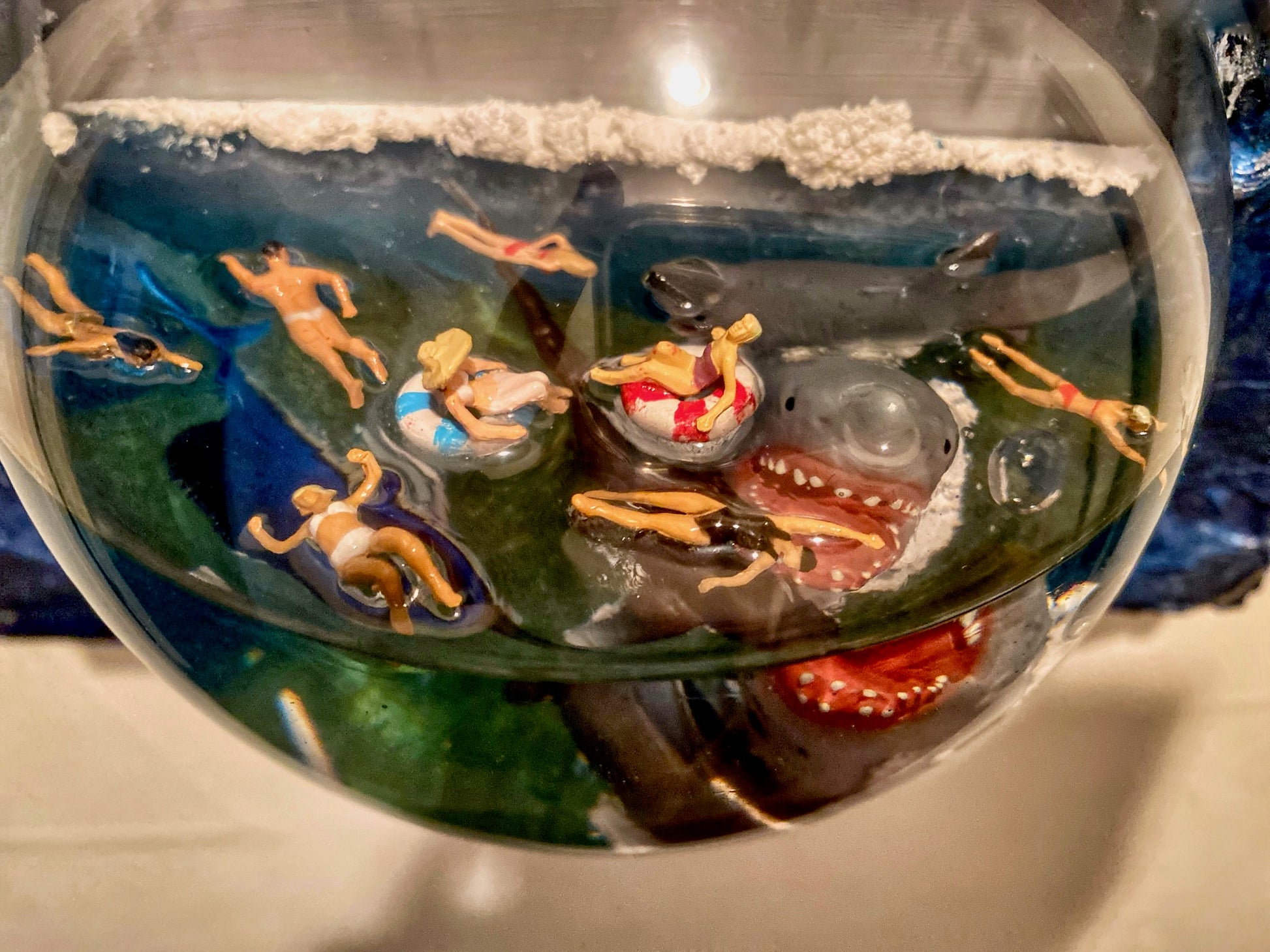 Prepare to be transported into a captivating underwater world with this mesmerizing art piece. Encased within a 9" bubble, a realistic ocean scene unfolds before your eyes. Beneath the crystal-clear surface, a graceful turtle glides gracefully alongside a majestic giant fish, while two sharks lurk beneath, their sleek forms breaking the surface.