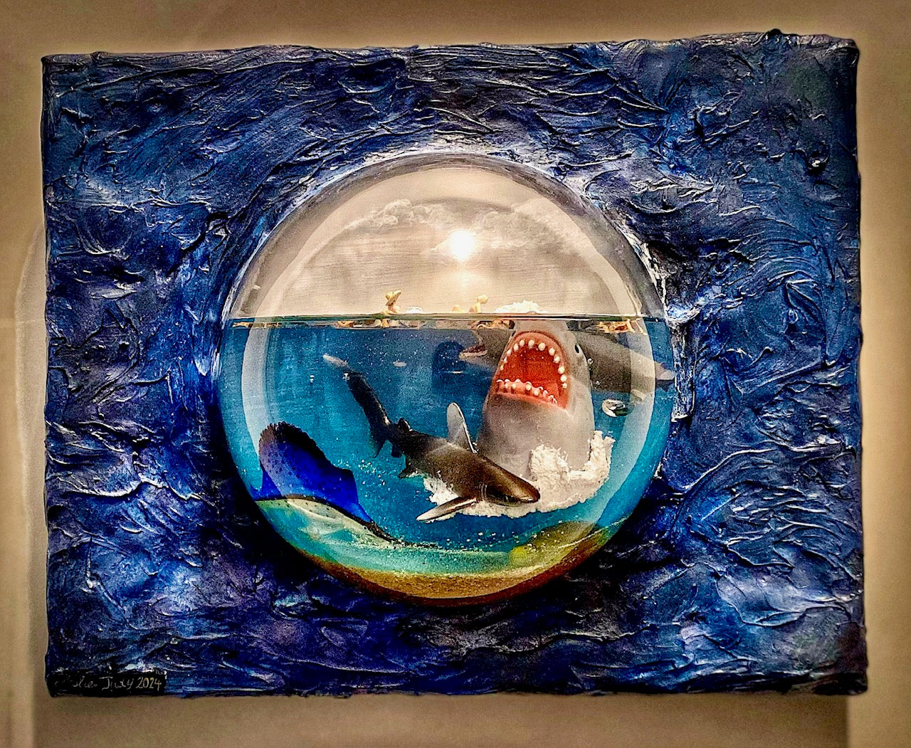 Meanwhile, above the depths, tiny swimming figures bask in the warm glow of a summer day, oblivious to the hidden dangers lurking just below. This evocative artwork invites viewers to contemplate the delicate balance between beauty and danger in the vast and mysterious expanse of the ocean.