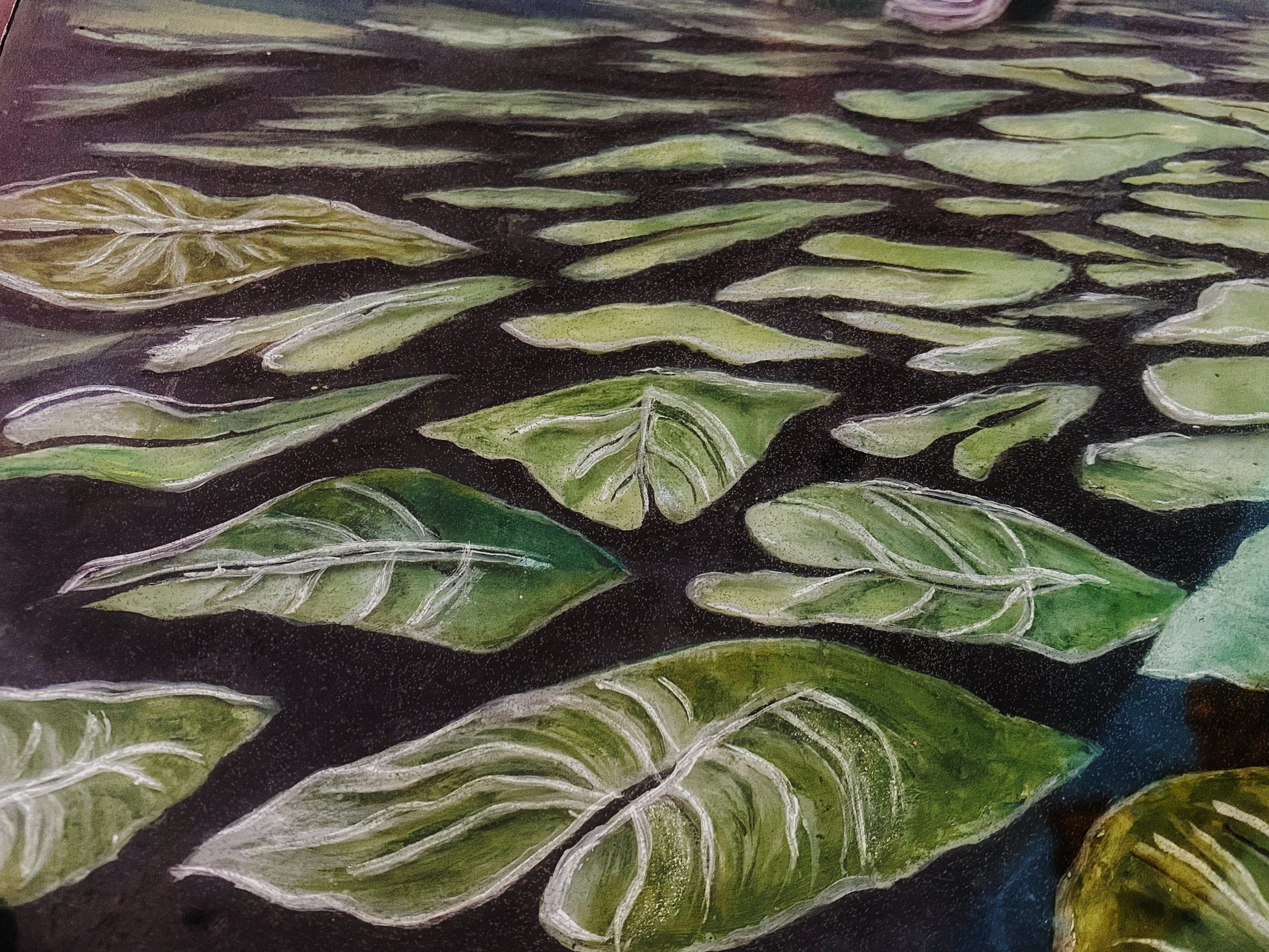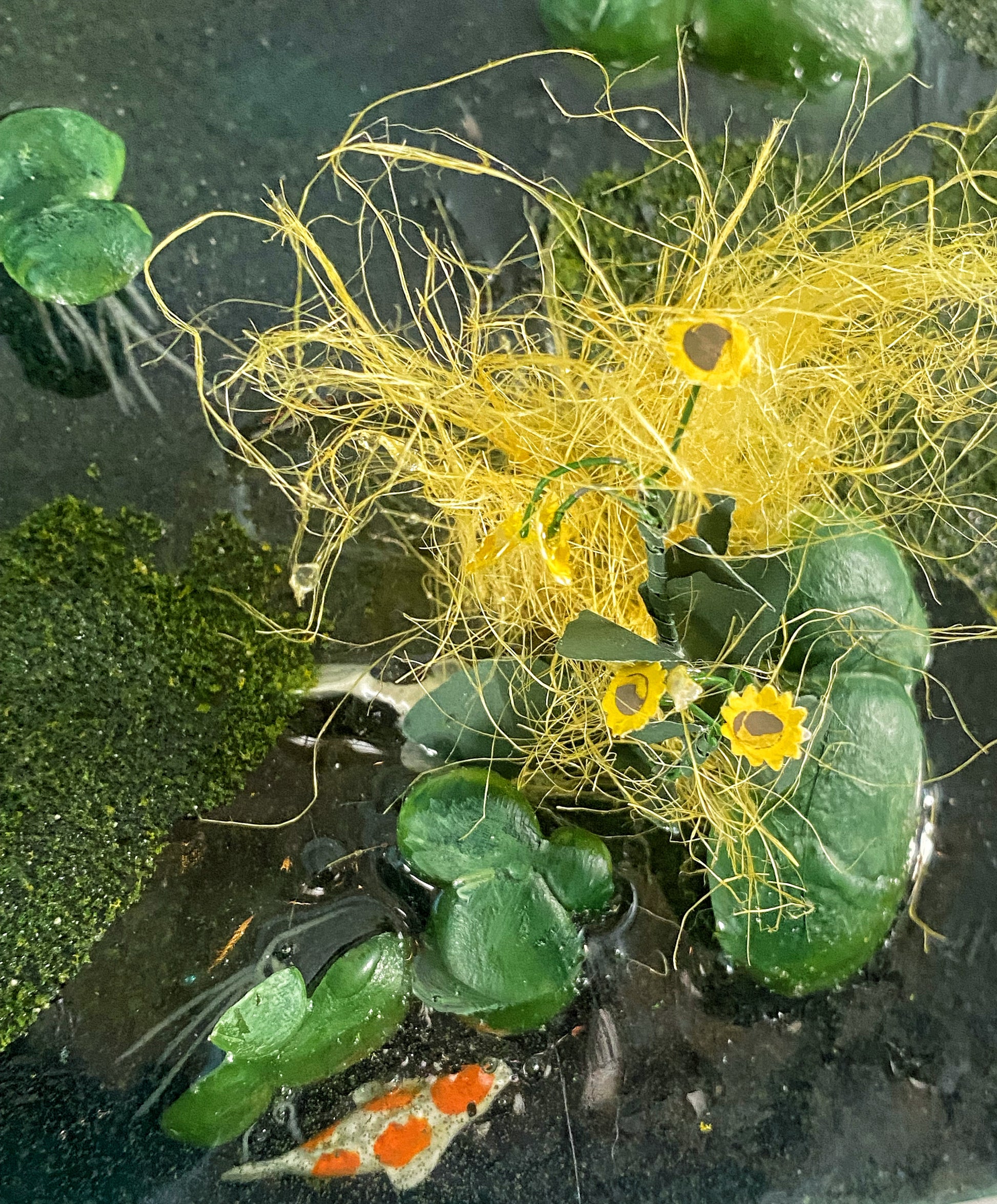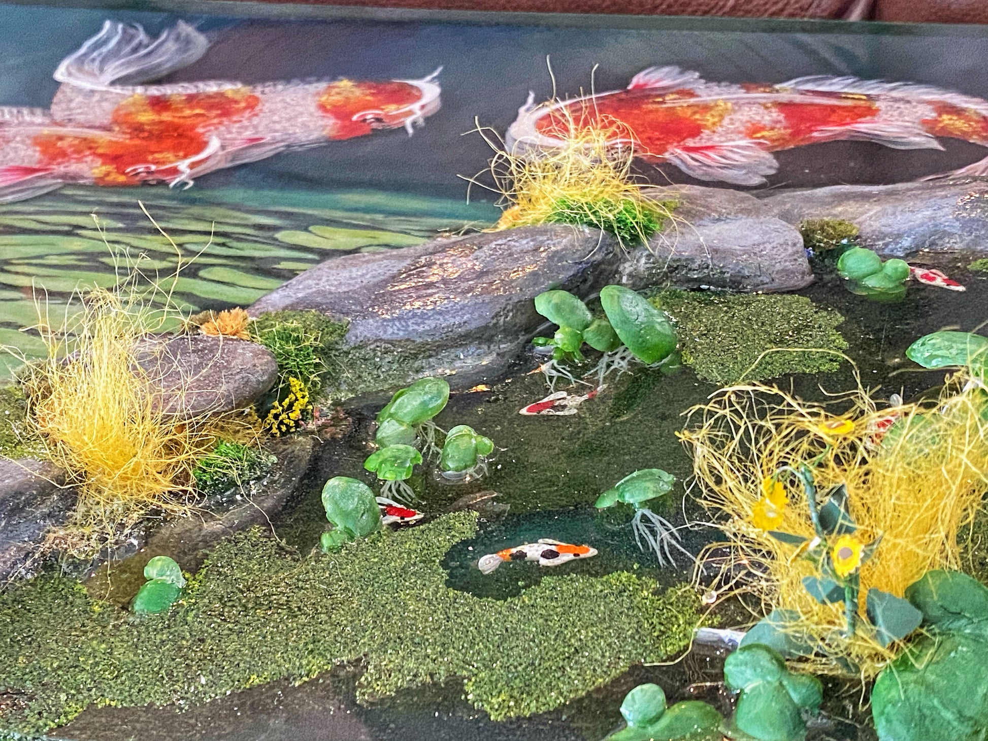 Beneath the surface, the intricate roots of the lilies are visible, subtly highlighted by the layers of resin. Delicate pond brush and flowers sway with the gentle currents, adding a touch of vibrancy to the underwater landscape.