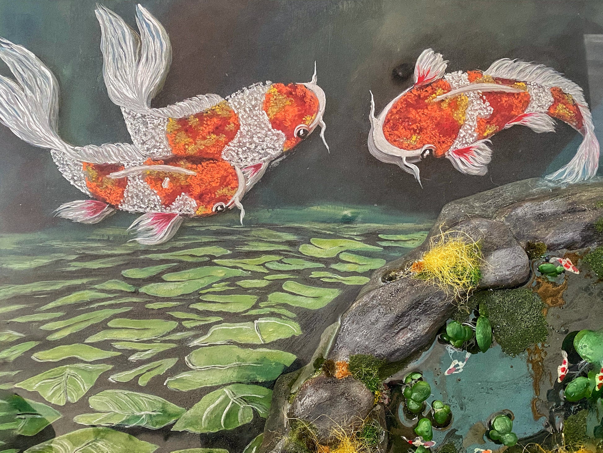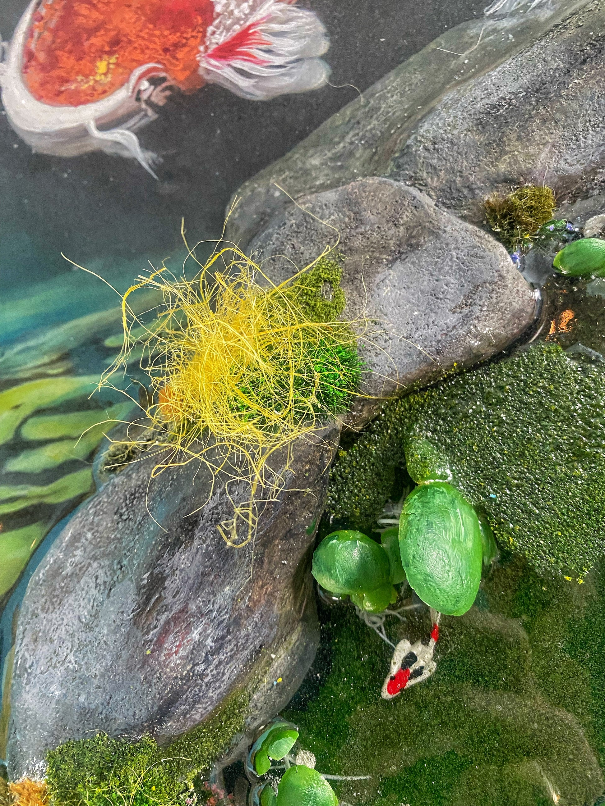 Amidst the floating lily pads, hand-painted in each resin layer, the koi fish create a natural spectacle of aquatic life. Separating the large koi from the smaller ones, plaster-made rocks add a touch of rugged realism to the scene.