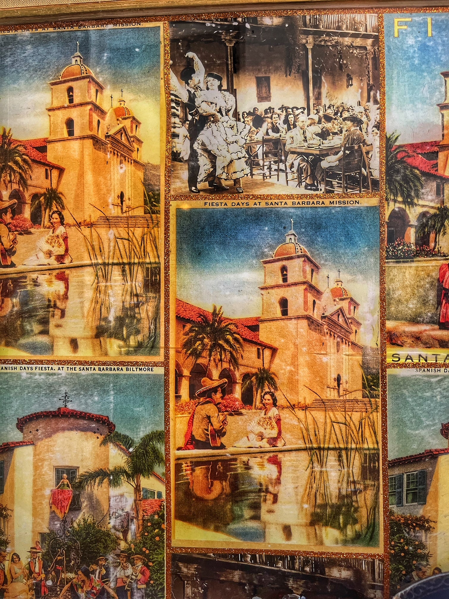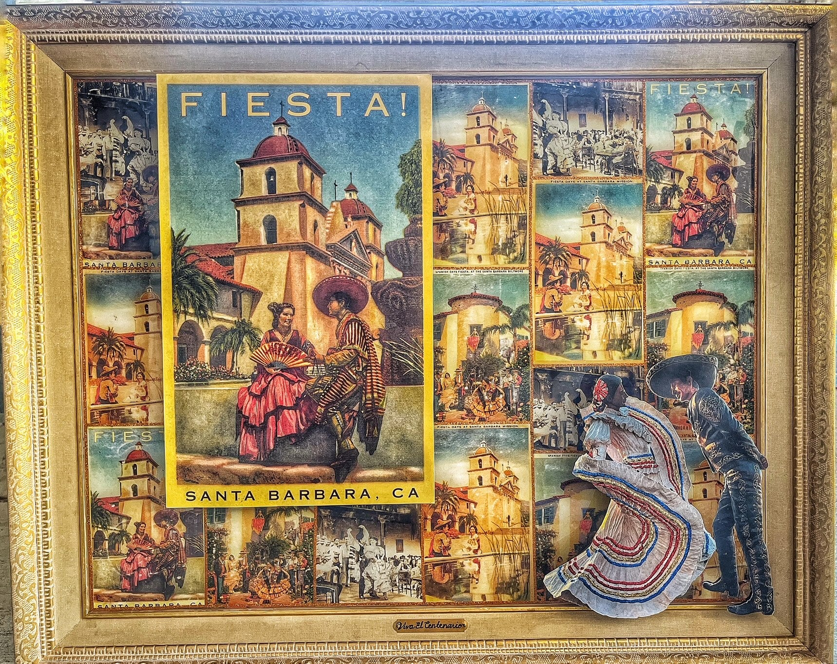This artwork is composed of prints of vintage postcards of Santa Barbara Fiesta days, copper lining and resin. This piece is a personal tribute to the memories and cultural ties close to my heart.